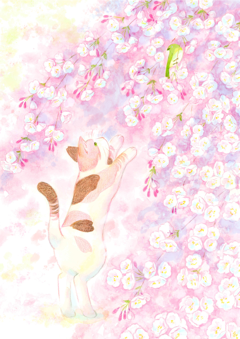 桜Exhibition2026 出展作品 春告げと花守り Spring bird and flower guardian cat